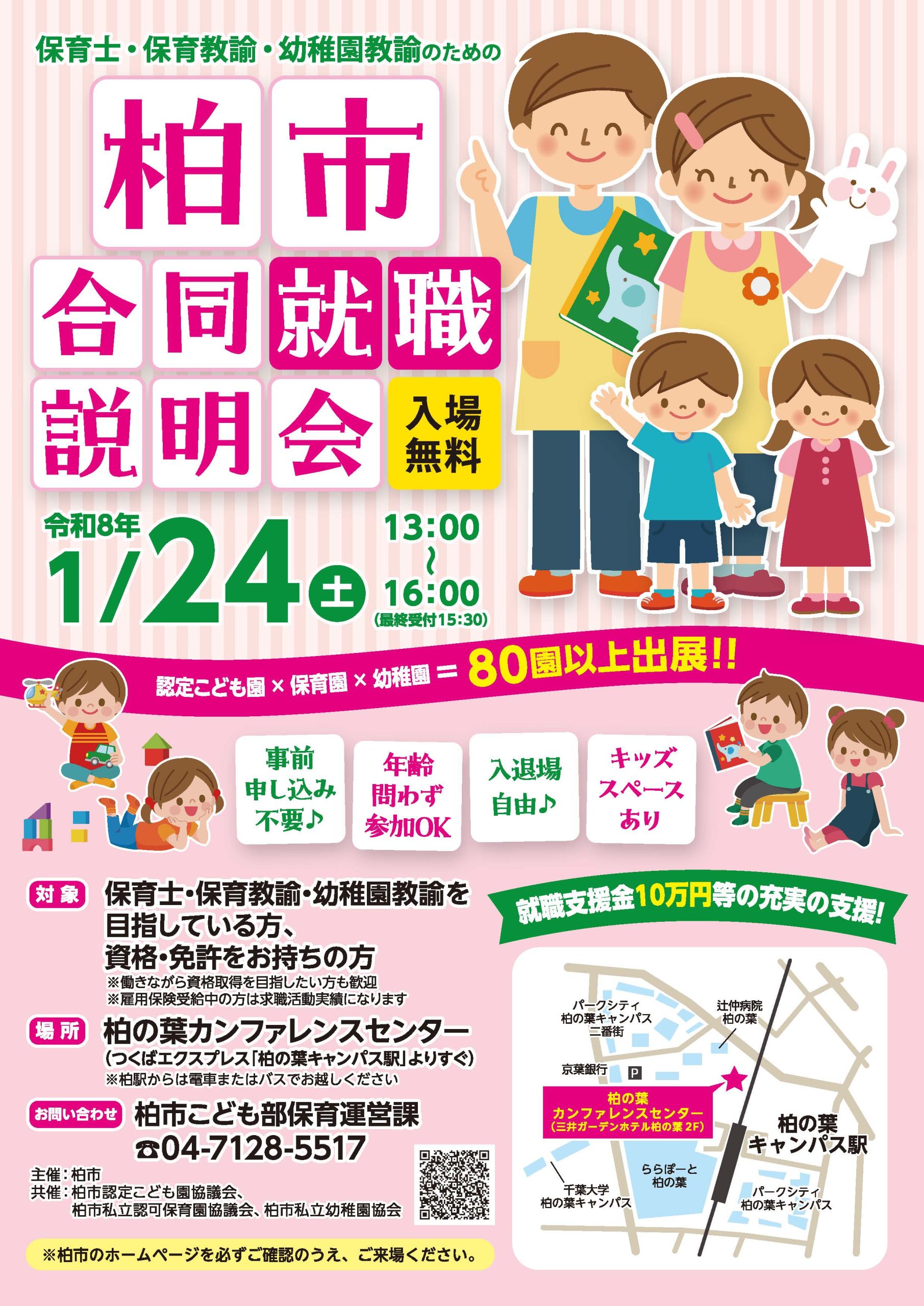 「柏市合同就職説明会」に参加します 2025.12.08 2026年1月24日(土)に開催されます、認定こども園・保育園・幼稚園が80園以上出店する就職説明会に、当園も参加いたします。 詳細は下記のチラシをご覧ください。 クリックで拡大できます